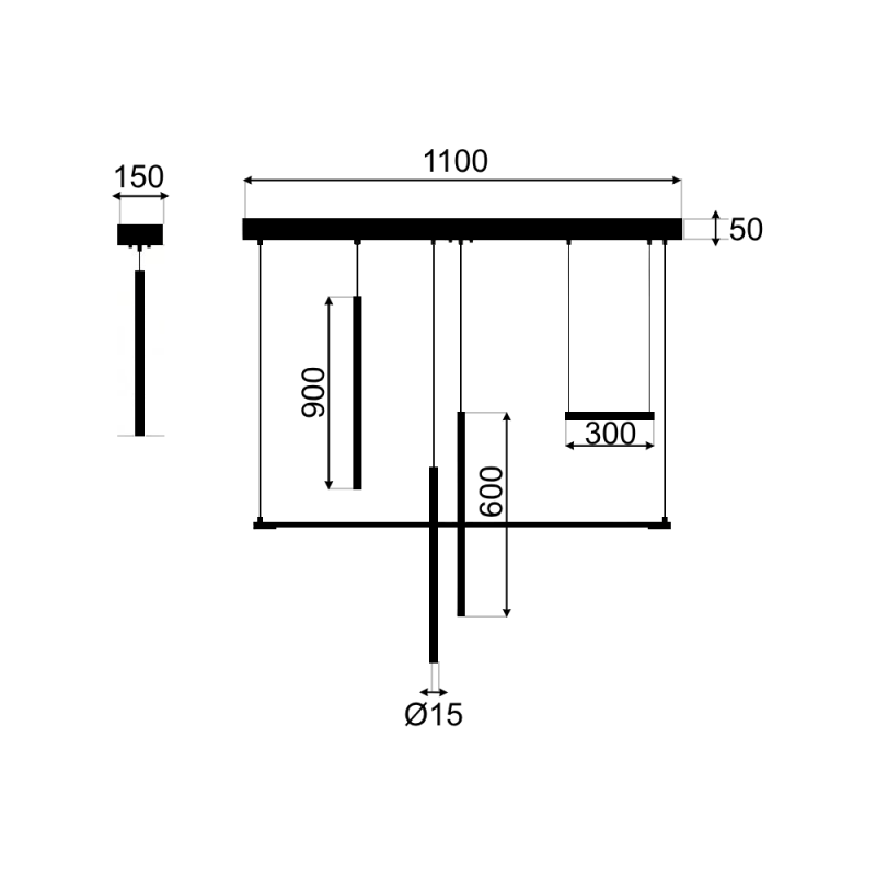 Izmēri: Bāze: L1100x150xH50mm, Gaismekļi: D15xL900+L600x3+L300mm