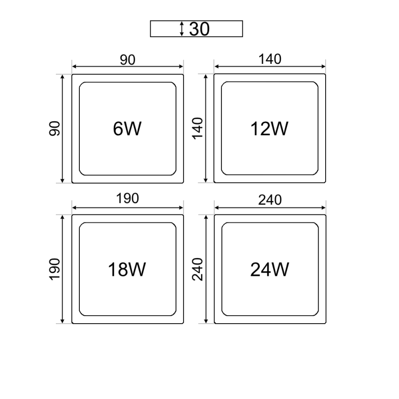 (90lm/W) Spriegums: AC100~290V Izmēri:190x190x30mm IP
